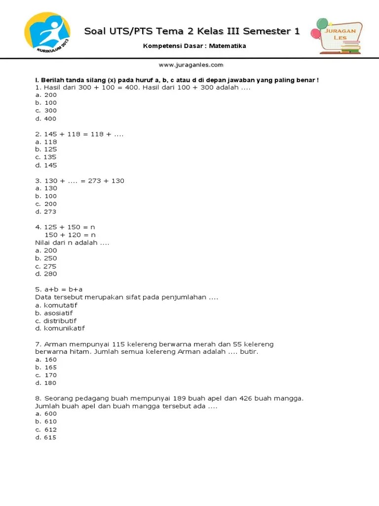 Kelas tiga (3) jenjang sekolah dasar terdiri dari pkn, ipa, ips, matematika, . Konten ini berisi soal uts pts kelas 3 semester 1 sd/mi k13. Kumpulan soal penilaian tengah semester (pts) kelas 3 semester 1 terdiri dari tema 1 & 2, matematika, dan bahasa jawa. Rancasari soal ulangan tengah semester matematika kelas 3 semester 1. Soal uts sd kurikulum 2013 semester 1 adalah soal terbaru tahun 2020 yang bisa menjadi contoh soal pts mi kelas 3 matematika k13 yang dilengkapi dengan .